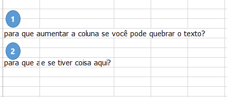Se você digita em uma célula algo maior do que ela, o Excel irá usar as colunas ao lado para te mostrar o texto (exemplo 1 abaixo), mas se existir algo ao lado, você não conseguirá ler tudo (exemplo 2 abaixo):
