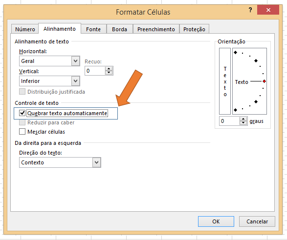 Na guia Alinhamento, marque a opção “Quebrar texto automaticamente”: